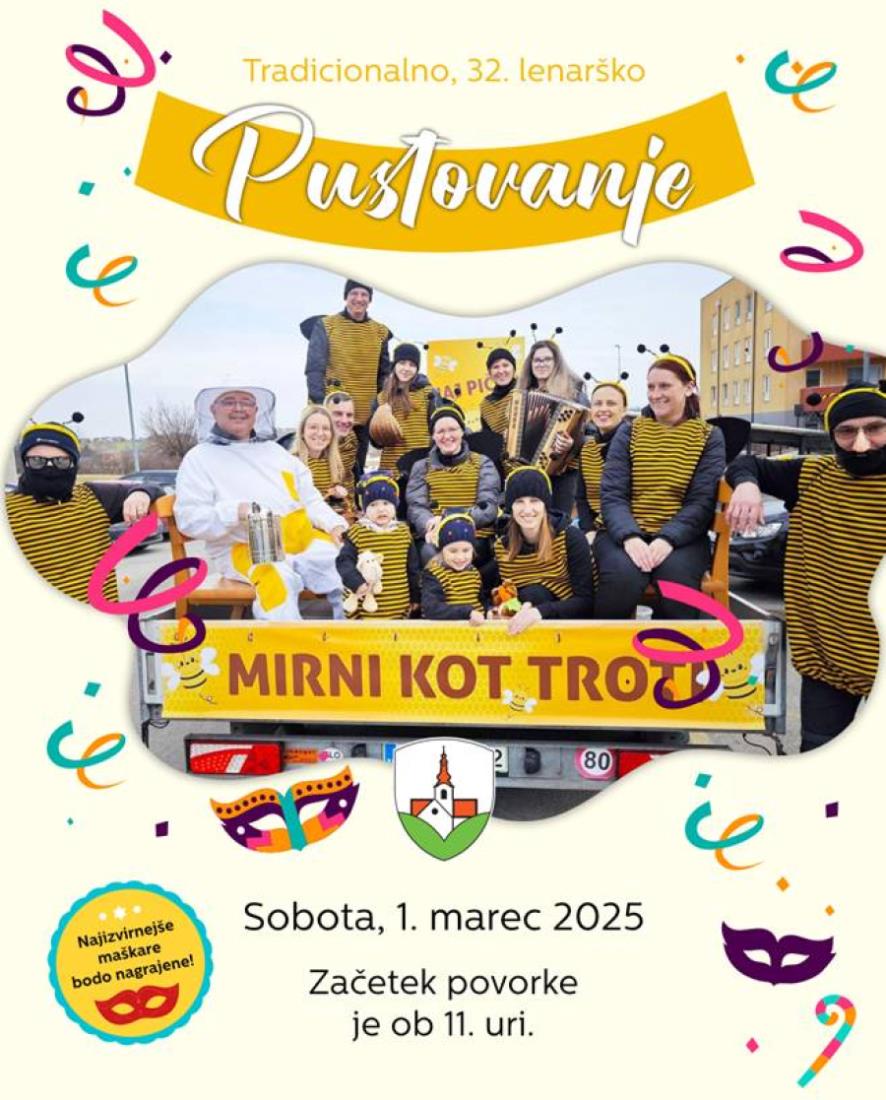 Veseli bomo vseh skupin in posameznikov, zato pričakujemo udeležbo in prijavo do petka, 21.2.2025 na Občino Lenart, po e- pošti na naslov darja.ornik@lenart.si ali na tel. št. 729 13 21.