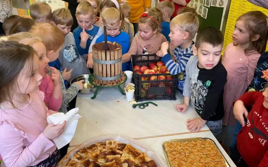 Danes je otroke v Vrtcu Lenart obiskal Janko Sekol iz Sadjarskega društva Slovenske gorice in jih podučil o vzgoji sadnega drevja, pridelavi ter predelavi jabolk, nato pa so skupaj izdelali svež jabolčni sok. Ob soku se je skozi luknjice majhne preše pocedila tudi jabolčna kaša, v katero so otroci brez obotavljanja pomočili prste in s širokimi nasmehi poskusili ustvarjeno. Posladkali so se tudi z domačim jabolčnim zavitkom in jabolčno pito, ki so ju prinesle gospodinje iz Društva kmečkih žena Voličina. Preden so se zbrani odšli vsak svojo pot so jim otroci odpeli še naučeno pesmico o jabolkih.