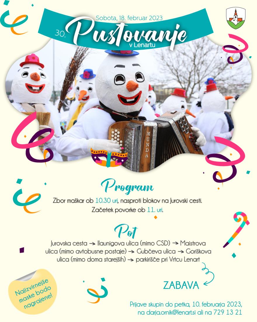 Prihaja pust, čas ko znorijo pametni in se spametujejo norci. Letos pripravljamo v Lenartu že 30. pustovanje, ki bo v soboto, 18. februarja 2023. Vabimo skupine, posameznike, otroke in odrasle, da se pridružijo povorki. Maškare se zberejo ob 10.30 uri, nasproti blokov, na Jurovski cesti. Pustna povorka bo krenila ob 11. uri, po Jurovski c., po Ilaunigovi ulici, mimo Centra za socialno delo, po Maistrovi, mimo avtobusne postaje, po Gubčevi, nadaljevala pot po Goriškovi ul., mimo doma starejših in se bo zaključila na parkirišču pri Vrtcu Lenart, kjer bo zabava.